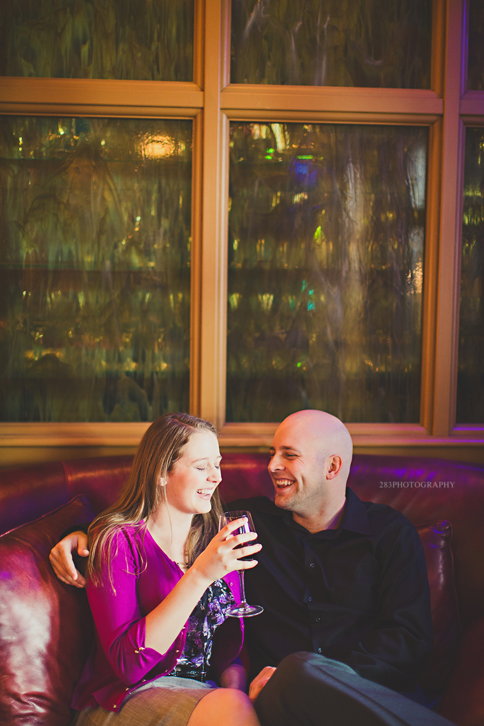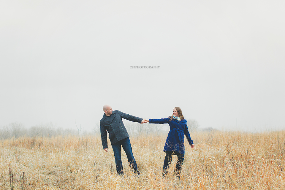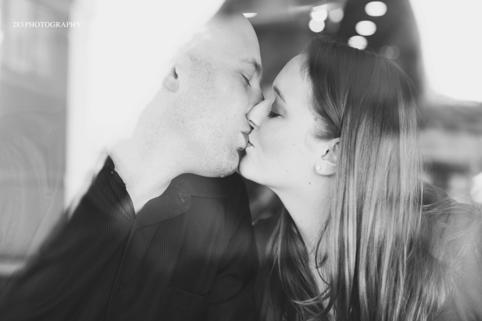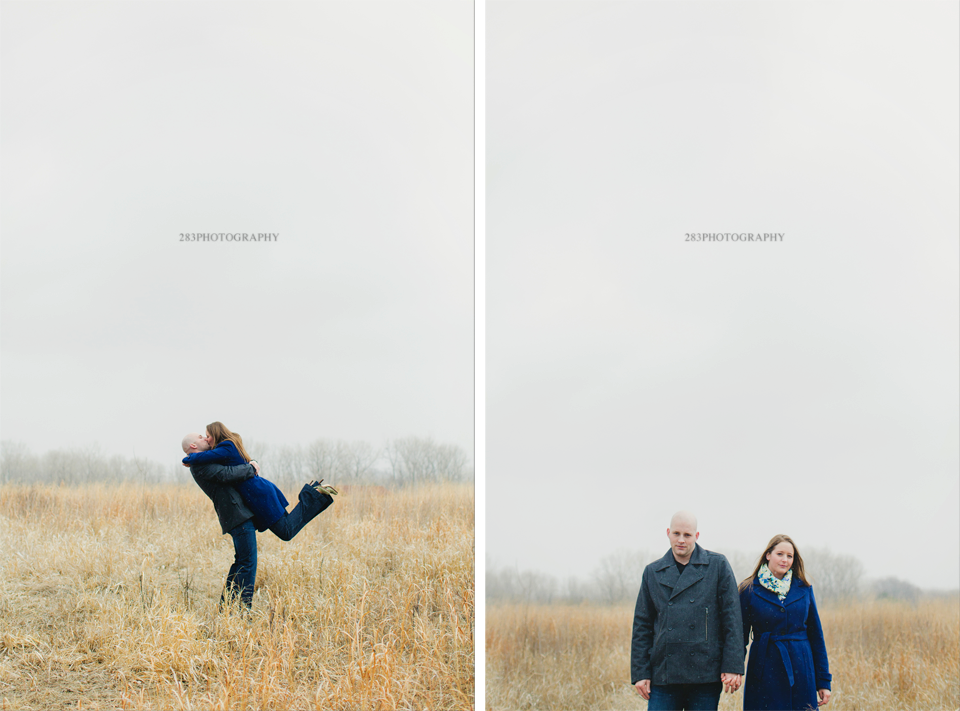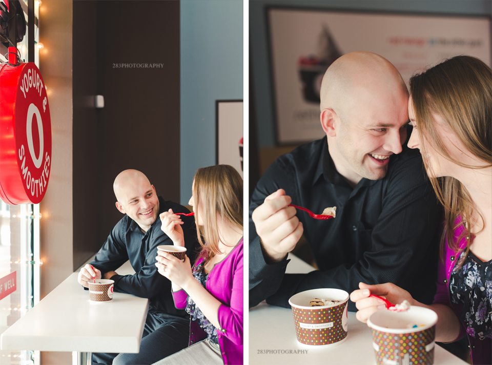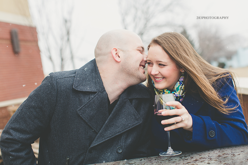 It was a strange winter in Sioux Falls this year, which was why I was wondering if Andree and Gil’s engagement session was going to happen on the day we planned for it. It was pretty mild in the beginning of the day, but once I arrived at our meeting location it began to snow very large snowflakes and I couldn’t help but get inspired by them. It’s not that often I get to shoot in a snowfall like this! We started out at a frozen yogurt shop and enjoyed some cold treats on a cold day. After the yogurt, Andree enjoyed a complimentary glass of wine next door, which warmed her up before we stepped outside.