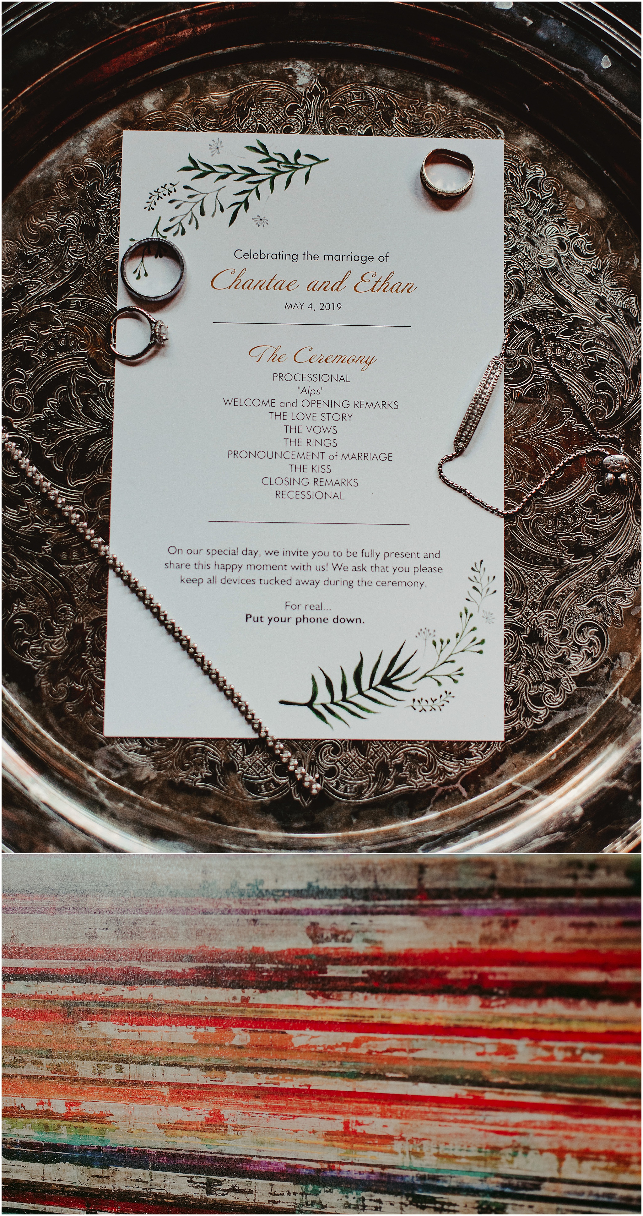 I didn’t think I could like Chantae any more than I already did, but go ahead… look at the bottom of that program.  Amen, sister!  Thanks for having a real appreciation for my job. Don’t get me wrong, the occasional iPhone, iPad, consumer camera, or even the “just starting out in photography” camera is expected and welcome to take photos at any wedding in my opinion.  However, it should only be done respectfully, and a friendly little reminder that I’m there to do a professional job they hired me to do, (so basically don’t potentially ruin it for them by blocking important shots I’m anticipating of moments that can genuinely only happen once), is always a neat idea.